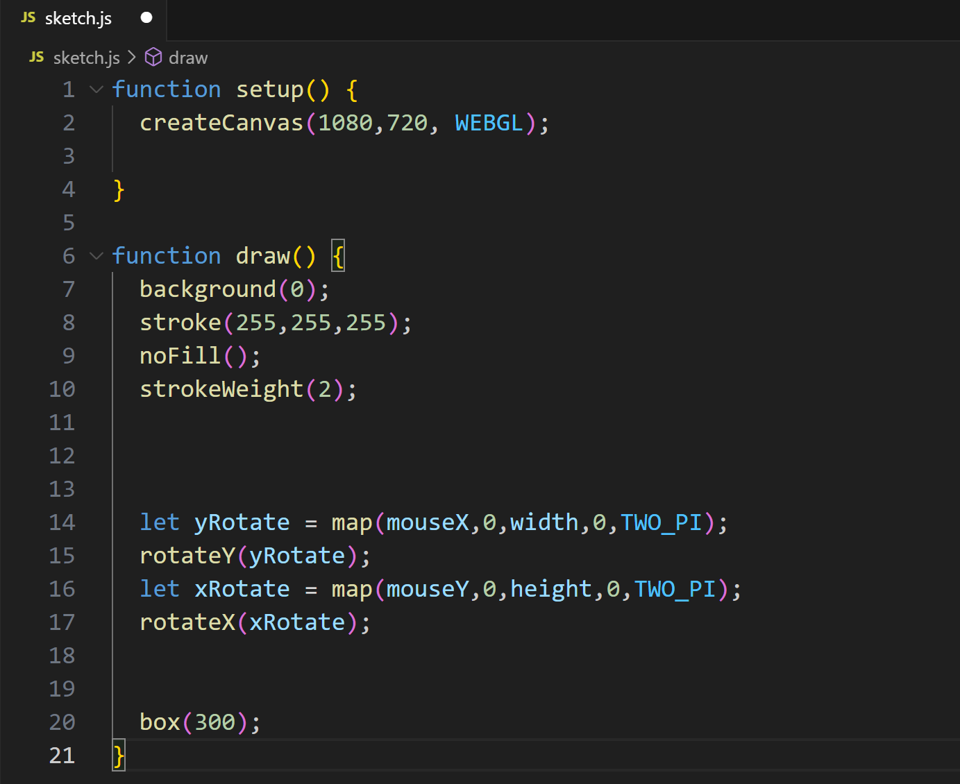 First, I used the map function to measure the mouse location in the canvas, separately for the x and the y positions, and then stored their values in two variables called yRotate and xRotate.